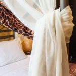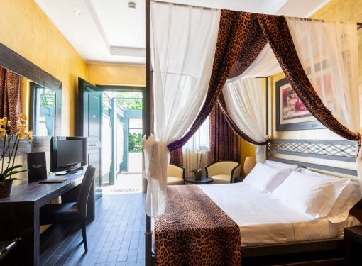 Il letto a baldacchino in ferro battuto, i tessuti dei tendaggi con fantasie “animalier” in versione zebrata o leopardata, l’arredamento etnico, i colori caldi delle pareti ed i quadri, contribuiscono a ricreare le atmosfere magiche ed il fascino della savana e delle terre africane.